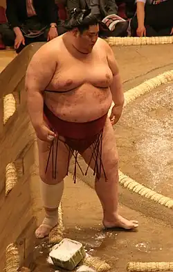 Ryūichi Yamamoto (山本 龍一, Yamamoto Ryūichi; born May 8, 1984), known by his shikona Yamamotoyama Ryūta (山本山 龍太), or simply Yama,[1] is a Japanese retired sumo wrestler from the city of Saitama in Saitama Prefecture. He made his professional debut in January 2007, and reached the top makuuchi division in January 2009. His highest rank was maegashira 9. At 265 kg (584 lb), Yamamotoyama is the heaviest Japanese-born sumo wrestler in history,[2] and is also thought to be the heaviest Japanese person ever.[1] In April 2011, he was told to retire by the Japan Sumo Association after he and several other wrestlers were found to be involved in match-fixing. He currently participates in sumo exhibitions and amateur tournaments, and has made a number of appearances in television shows, commercials and music videos.