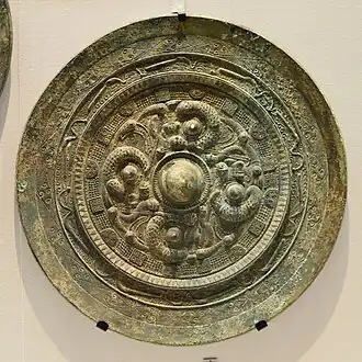 The Yanai Chausuyama Kofun is a zenpō-kōen-fun (前方後円墳), which is shaped like a keyhole, having one square end and one circular end, when viewed from above. It is located on Mount Mukoyama at an elevation of 75 meters overlooking the Seto Inland Sea. It is 80 meters long, with a posterior circular diameter of 50 meters, and an anterior width of 40 meters and is orientated to the south-southwest. It was excavated in 1892 by local residents, at which time bronze mirrors, iron swords, iron halberds, and other grave goods were discovered. Of the five bronze mirrors, the largest had a diameter of 44.8 centimeters and is preserved at the Tokyo National Museum along with one other example. Another is at the Yamaguchi Prefectural Museum and one more is at the Chausuyama Burial Mound Museum. The whereabouts of the remaining one is unknown, and most of the other artifacts discovered are in private collections.[2] These artifacts date the tumulus to the end of the fourth century.