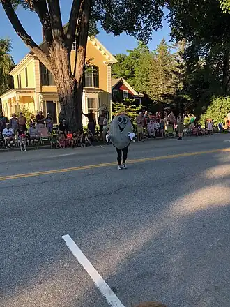 The Yarmouth Clam Festival is an annual three-day event which takes place in Yarmouth, Maine, starting on the third Friday every July. Established in 1965 as a successor to the town's late-August Old Home Week (itself started in 1911), it is hosted by the Yarmouth Chamber of Commerce, with the aim of raising money for approximately thirty local non-profit organizations, churches, and school groups. The event draws visitors from all over the country.[1] As a result, Yarmouth, a town with a population of around 9,000, accommodates approximately 80,000 people over the course of the weekend.[2] A section of the former population have made it a tradition to stake out their Friday-evening parade viewpoint with a chair several weeks before the event — even as early as May,[3] though this may be in an ironic fashion.