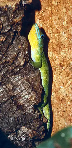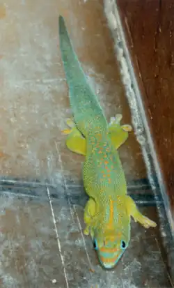 The yellow-throated day gecko (Phelsuma flavigularis) is an endangered diurnal species of gecko from eastern Madagascar. It typically inhabits rainforests and dwells on trees. This endangered species feeds on insects and nectar.