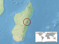 This species has a limited distribution. It is only known from the area around Andasibe on the east coast of Madagascar, about 100 km (62 mi) east of Antananarivo.