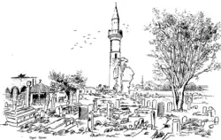 This Neighbourhood takes its name from a new mosque built out of the ruins of a very beautiful and interesting medieval church. The mosque is a square building occupying the south east corner of an old Moslem burial ground. About in the centre of the cemetery stands a block of ruins consisting of the south-west angle of the medieval church of which the turret staircase has been carried up as the minaret of the mosque, hence the preservation of the fragment. The surrounding burial ground is covered with ancient fragments used as tombstones.[13]