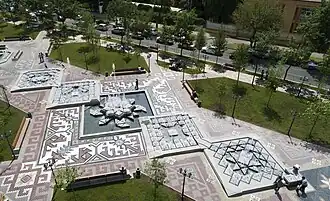 The block pavement of the park with total area of 5.420 sq.m is made of 500,000 pieces of 7 colours of granite cobbles 10x10x5 cm in size. The entire surface under the pavement is reinforced by concrete and has its appropriate drainage system. The pavement patterns of the park are almost entirely taken from the ornaments of ancient traditional Armenian carpets, and part of the ornaments repeats the patterns of Erebuni fortress of the Urartian era.