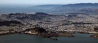![]() ![]() Aerial views of San Francisco from the southeast (2011) Top: McLaren Park is the forested area in the left-middle. Other landmarks include Bayview Park and Candlestick Park in the center foreground, Sutro Tower in the center background, and the Golden Gate Bridge in the right background. Bottom: Cropped to focus on McLaren Park | |