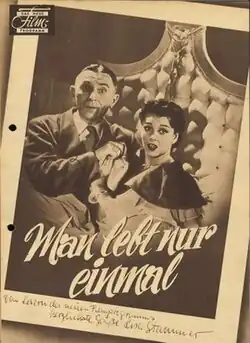 You Only Live Once (German: Man lebt nur einmal) is a 1952 West German comedy film directed by Ernst Neubach and starring Theo Lingen, Marina Ried and Rudolf Platte. It was a remake of the 1931 film The Man in Search of His Murderer.[1] It was shot at the Spandau Studios in Berlin. The film's sets were designed by Emil Hasler and Walter Kutz.