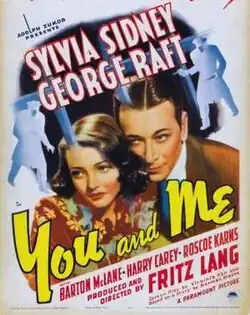 You and Me is a 1938 American crime drama/comedy/romance film directed by Fritz Lang. It stars Sylvia Sidney and George Raft as a pair of ex-convicts on parole, working in a department store whose owner, played by Harry Carey, routinely hires former criminals to give them a second chance. It was written by Norman Krasna and Virginia Van Upp.