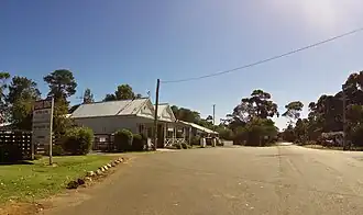 The state government set aside land for a townsite at Youngs Siding in 1903, but the land was not surveyed until 1916 and the town was gazetted the following year.[6][7] The new town was named just Youngs, with the siding dropped from the name, but Youngs Siding remained in use locally and was eventually restored as the proper name in 1999.[8][9] The name Youngs results from a local farmer, David Young, who took up land in the area in the 1850s and died in 1918.[10] Young, who farmed at Marbelup, east of Youngs Siding, had come to Australia from England at the age of nine. He hosted Prince Albert and the future George V at his homestead, Marbelup Cottage near the shore of Wilson Inlet, in 1881 when they came to Western Australia as midshipmen on HMS Bacchante, and took them on excursions in the area.[8][11][12]