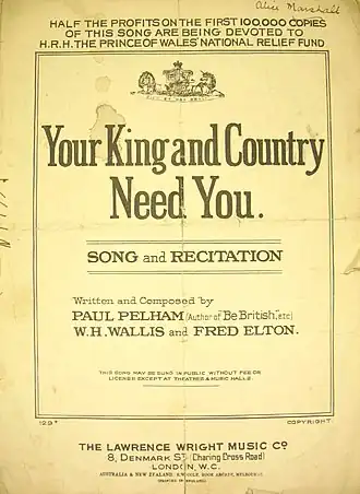Several different recruiting songs with the name "Your King and Country Want/Need You" were popularised in Britain at the beginning of the First World War. Your King and Country Need You was a popular song and recitation, with words by Paul Pelham, and music by W. H. Wallis and Fred Elton, published in London at the start of the war in 1914 by Lawrence Wright Music.[1] It was written as a recruiting song with the aim of persuading men to volunteer to fight in the War. Half the profits on the first 100,000 copies were to be given to the "H.R.H. Prince of Wales' National Relief Fund".[1]