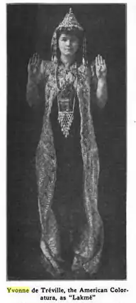 Yvonne de Tréville made her debut in New York in 1897, and the next year was playing Mimi in the New York debut of Puccini's La Bohème. In 1902 she first appeared with the Paris Opéra-Comique as Lakmé.[3] Over the following decade, she sang in Stockholm, St. Petersburg, Budapest, Nice, Berlin, Bucharest, Prague, Frankfurt, Cologne, Hanover, Cairo, and Brussels; she was noted for her strong language skills.[1] She sang Mimi again at the Vienna Court Opera in 1909 and 1910. She returned to the United States in 1912.[4] Tréville appeared on the Broadway stage in Carmen in 1918 and 1919.[5]