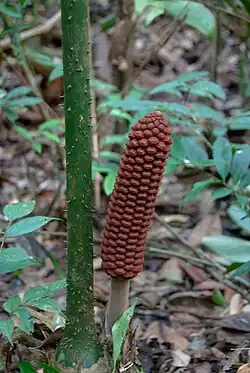 Like all Zamias, Z. amazonum is dioecious, with each plant being either male or female. Male strobili (cones) are cylindrical, 6 to 10 centimetres (2.4 to 3.9 in) long and 1 to 2 centimetres (0.39 to 0.79 in) in diameter, brown in color, and stand on 8 to 15 centimetres (3.1 to 5.9 in) long peduncles (stalks). Female cones are 10 to 15 centimetres (3.9 to 5.9 in) long and 3 to 5 centimetres (1.2 to 2.0 in) in diameter, dark red-brown in colored, and stand on 5 to 8 centimetres (2.0 to 3.1 in) long stalks. Seeds are ovoid, 1 centimetre (0.39 in) long and 0.5 centimetres (0.20 in) in diameter, with a red sarcotesta (outer fleshy coat).[3]