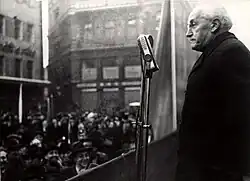 During the Nazi occupation of the Czech Lands, the Nejedlý family fled to the Soviet Union, where he supposedly helped Czech resistance activities from afar and officially joined the Communist Party in 1939.[4] At this time, his son Vít Nejedlý (1912–45), whose short career in Prague had focused on Communist agitprop pieces and workers' choruses, was involved with a Czech brigade attached to the Red Army, whose band he attempted to emulate. After the end of the war (and Vít's death from typhus after the battle of Dukla, January 1945), Zdeněk Nejedlý returned to Prague to participate in the postwar government. Initially in Eduard Beneš's Third Republic he was made Minister of Education, Arts, and Sciences, but this was exchanged for Social Security by 1946. After the Communist seizure of power (the “February Revolution”) in 1948 he returned to Culture and Education with enhanced powers, a post he kept until 1953.