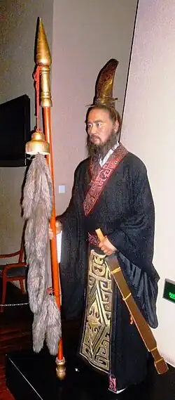 Zhang Qian (Chinese: 張騫; died c. 114 BC)[1] was a Chinese diplomat, explorer, and politician who served as an imperial envoy to the world outside of China in the late 2nd century BC during the Western Han dynasty. He was one of the first official diplomats to bring back valuable information about Central Asia, including the Greco-Bactrian remains of the Macedonian Empire as well as the Parthian Empire, to the Han dynasty imperial court, then ruled by Emperor Wu of Han.