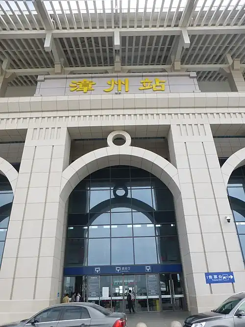 Zhangzhou railway station is the main train station of the Zhangzhou metropolitan area in China's Fujian Province. The station is located in Hongtang Village (洪塘村) of Longhai District, about 10 km south of downtown Zhangzhou.[1] It is located on the common section of the Longxia Railway (Longyan-Xiamen; opened in mid-2012) and the Xiashen Railway (Xiamen-Shenzhen Railway; opened at the end of 2013).