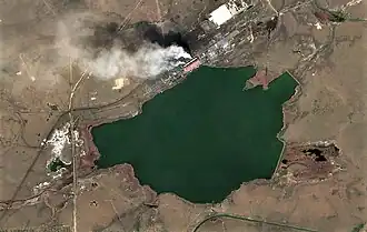 Zhyngyldy is one of the main lakes in the area surrounding Ekibastuz and is part of the Irtysh Water Management Basin. It is located 11 kilometers (6.8 mi) to the north of the city. The Ekibastuz GRES-1 Power Station rises by its northern shore. The reservoir was formed by filling an endorheic intermittent lake (sor) with water from the Irtysh–Karaganda Canal in order to cool the adjacent thermal power station. The ashes of the station are dumped into nearby lake Karasor.[2][3]