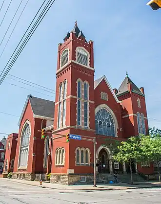 Zion Lutheran Church is a historic Lutheran church located along Prospect Avenue near downtown Cleveland, Ohio, United States. Formed in the 1840s, the congregation built the present building shortly after 1900, along with an adjacent church school. Both buildings have been named historic sites. The school is no longer open.
