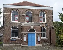 The former Sunday School, now a church hall, is built of brown brick with an eaves band and a Welsh slate roof. It has one storey and three bays. On the north front are three round-arched panels, the outer ones containing round-headed sash windows, and the middle panel with a sandstone plaque containing an inscription and the date.[2]