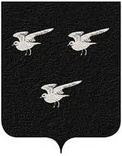 The family had several heraldic versions. Among the principal: “Sable, three argent birds volant, beaked and membered gules.”[2]